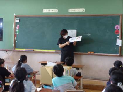 子どもたちは英語の絵本に興味津々。「すごい!」「おいしそう!」などの声や先生の後に続いて単語の発音練習をして楽しんでいました。次回は,校長先生による英語絵本の読み聞かせです。今から待ち遠しいです!