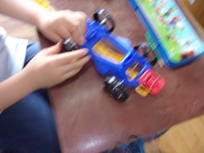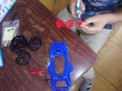 理科で「ゴムと風の力」の学習をしています。キットを使ってゴムの力で走る車を作りました。細かいパーツを上手にハサミで切り離していきました。先生の説明をよく聞いて,順番に組み立てていきます。さあ,上手に完成したかな?