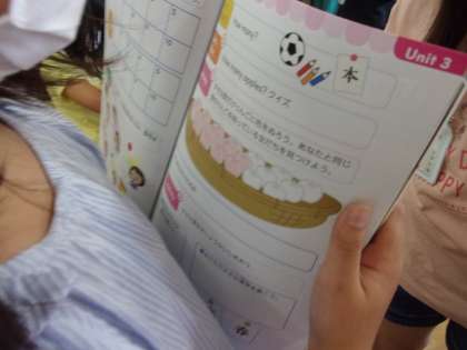 自分のリンゴの数を決め,“How many apples?”と尋ねて,同じ数の人を探します。見事に3人そろうと,シールゲット!残念ながら,同じ数字の人を見つけられなかった人たちも,たくさん,“How many apples?”と尋ねることができていました。