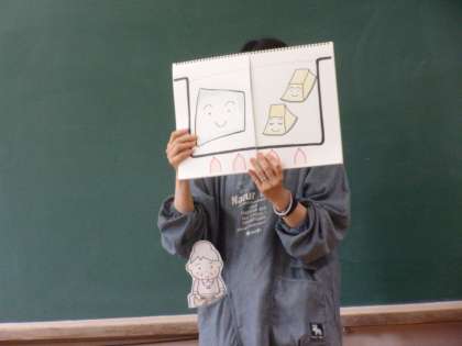 しかし,栄養教諭の片山先生が今週の火曜日の給食時間,1年生に紙芝居を読みに来てくださいました。お話は,「にしんとなすのであいもん」です。おばあちゃんの手によって脂の多いにしんさんがいろいろな野菜と出会います。でも,どの野菜もべたべたになり,うまくいきません。そこで出会ったなすさん。にしんさんの脂をたくさん吸い込んで,とってもおいしいなすさんに・・・