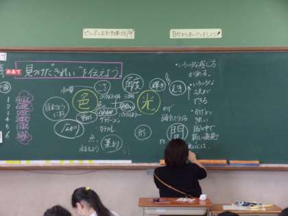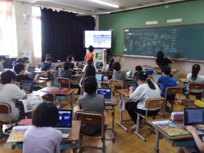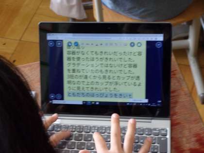 図画工作科の「水から発見ここきれい!」の学習が間もなく終わります。今日は,「みつけたきれいを伝えよう!」のめあての元,学習のまとめと振り返りをギガ端末を活用して行いました。「容器がなくてもきれいだったけど,容器を使った方がもっときれいだった。」などたくさんの振り返りがみられました。