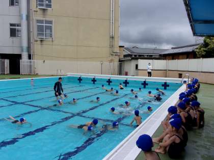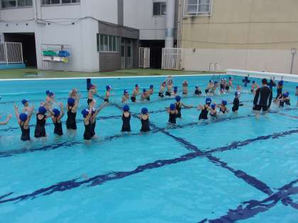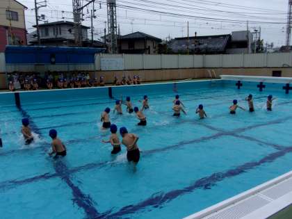 先週から,水あそびが始まっています。1年生は,まねっこ遊びからです。ペンギン・アヒル・カニ・カエル・ワニなど,どんどん様々な生き物になっていきます。「次は,カエルだ。」「ワニが一番好き。」と言いながら楽しく水に慣れていっています。「先生,顔に水をかけられたよ。」「ワニさんで顔をつけてお休みできた。」と自分たちでも成長を感じているようです。