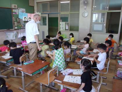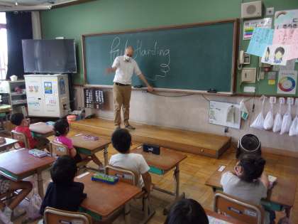 始めは,ポール先生の自己紹介。名前や出身国,年齢をおもしろくクイズにして紹介して下さいました。子どもたちは,なかなか国の名前が出ずに,真剣にううん・・・と考えていました。次は,好きなものビンゴです。I like〜. Do you like〜? の表現を知り,ビンゴを楽しむ中で何度も英語を使っていました。ポール先生は,「Wa〜SaBi〜〜.」などと,陽気に楽しく進めてくれました。