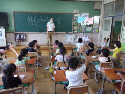 金曜日は,初めての英語活動の授業でした。ポール先生とも初めて出会います。イングリッシュデイで学んできた英語のあいさつを堂々と使って,ポール先生ともあいさつができました。