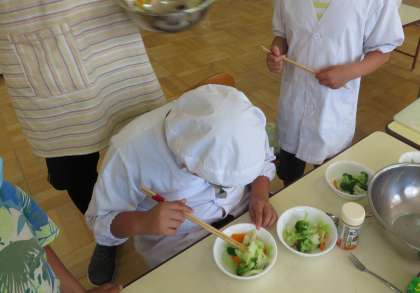 調理実習をしました。5年生は「ゆで野菜」,6年生は「野菜炒め」を作りました。手順を確認し,役割分担ごとに野菜を切ったり,ゆでたり,炒めたりしました。包丁の扱いに気を付けて,上手に野菜を切る様子や,沸騰している鍋の中に,野菜を慎重に入れる様子が見られました。みんなで協力して作った料理を給食の時間においしくいただきました。子どもたちは,「おいしい。」と笑顔で食べていました。