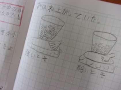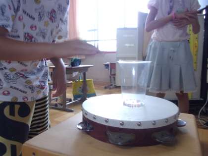 理科の学習で「音のふしぎ」の学習が始まりました。音が大きくなると震え方も変わるのか、コップの中に入れたビーズの動きを見て調べています。