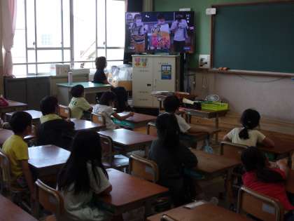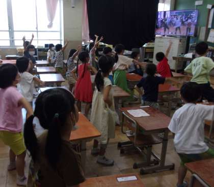今日のアクティブタイムは、図書委員さんと体育委員さんでした。図書委員さんは、生き物クイズです。写真の一部が見えたとたん、すかさず考えた答えをそれぞれ言いながら参加しました。体育委員さんは、準備運動のダンスの紹介をしてくれました。「曲、知っている。」「とっても上手。」手拍子や体をゆらして聞きました。「もっと見たい。2回目もして。」とテレビに向かってお願いしている子もいました。