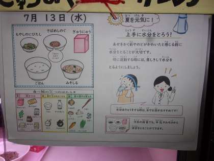 夏場で暑く,汗もかきやすいですが,給食の時に出る牛乳や汁物からも水分をとって,元気に過ごしましょう!
