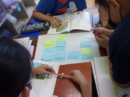 付箋紙を使って、必要なものって何だろう?と考えたことをグループで紙にまとめていきます。最終的に5つに絞る必要があるので、理由を話し合いながら、決めていきます。楽しみです。