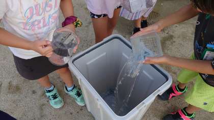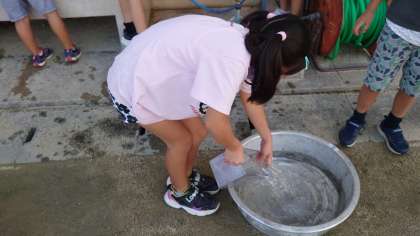みんなで協力して,楽しくたらいや傘入れのかさを確かめることができました。
