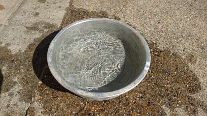 1Lマスを手に持ち,たらいや大きな傘入れにどれだけの量の水が入るのかをみんなで確かめています。