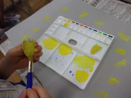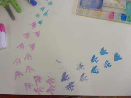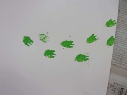 今回は、スタンピングをしました。ねずみの出てくるお話なので、それに合わせて、ねずみの足跡を作りました。段ボールを足跡の形に切り、絵の具をつけて、思い思いに画用紙に足跡を押していきます。