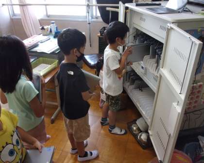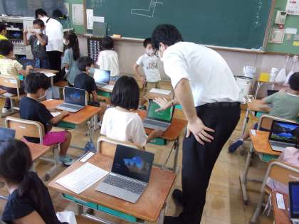 そして、初めてパソコンをさわり、電源をつけました。パソコンの蓋を開けるだけで、「おおー。」と子どもたちは嬉しそうです。充電がうまくできていなくてパソコンの電源が入らなかったり、何度IDやパスワードを入れても正しく入力できなかったり、トラブルもありました。しかし、中岡先生に自分から進んで聞いたり、友だち同士で助け合ったりしてみんなできるようになりました。これからも少しずつパソコンでできることが増えたらうれしいです。