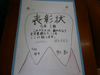 むし歯治療が終わったクラスに賞状を渡しました。