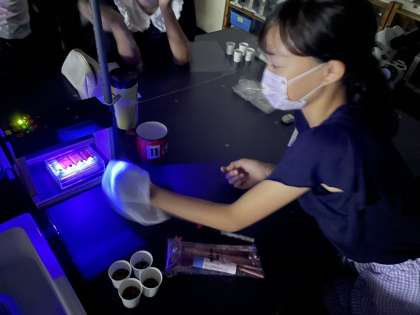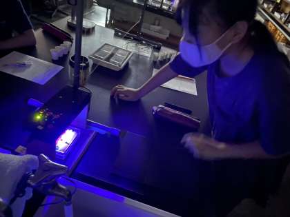 紫外線に当てて,お茶の色も確認していきます。