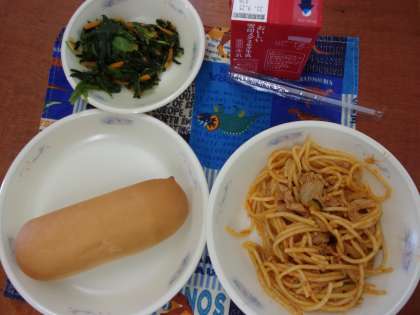 〇ほうれん草の見た目がきれいでした。「イタリアンスパゲティ」のズッキーニがしゅんだったので、おいしかったです。トマトケチャップの味もおいしかったです。(3年生)