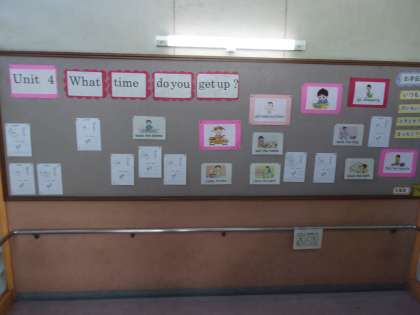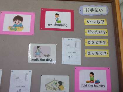 外国語の掲示板になりました!現在学習中のUnit4「What time do you get up?」では、頻度を表す言葉、usually/always/sometaimes/neverを用いて、家での手伝いの様子を伝えたり、休日の様子を伝えたりする学習を進めています。