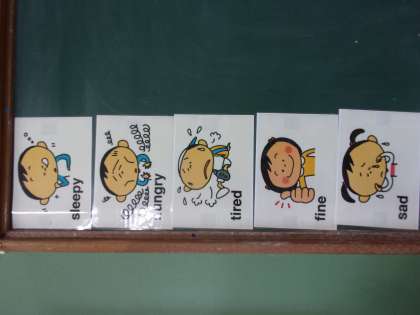 今日も子どもたちは、英語をたくさん使って楽しみました。朝の会の健康観察では、英語活動の授業で学習した「I‘m ○○.」を使って、happyやfine、sleepy、tiredなど、元気よく自分の調子を伝えています。そのやりとりの中でも「summer」や「miracle」など、新しい言葉も出てきます。日ごろから生活の中に英語があるんだなあと一緒に楽しんでいます。