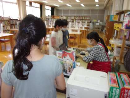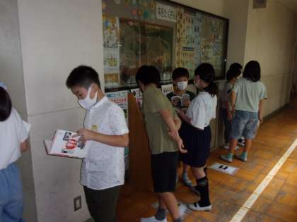 5年生は読書好きな子どもが多いです。休み時間にも熱心に読書ををしている姿をよく見かけます。図書室では、1週間に1人1冊借りることができます。休み時間には行列ができることもあります。