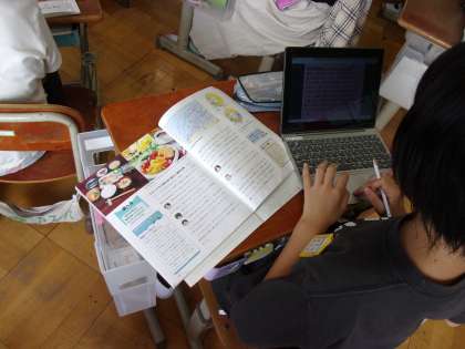 5年生では、さまざまな教科でGIGA端末を用いた学習を行っています。特に社会科では、学習課題に沿った探究学習をGIGA端末を用いて行います。インターネットを活用したり、教科書で調べたりと、子どもたちは熱心に学習をしています。