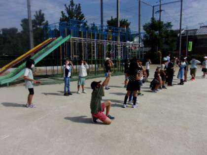 外へ出たついでに、国語科「ちいちゃんのかげおくり」に出てくる「かげおくり」という遊びも実際にやってみました。さて、みんなのかげは空に映ったかな??
