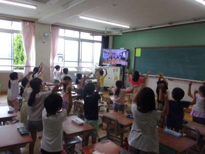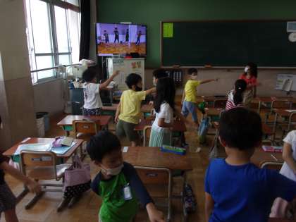 子どもたちは、50m走に玉入れ、学年リレー、おみこしリレー・・・と体育発表会にむけて覚えること頑張ることがいっぱいです。その中での楽しみの1つが準備運動のダンスです。体育委員会さんが作ってくれたビデオを見ながら、毎日楽しく踊っています。一番はじめに見たときには、「難しく無理だ。」「できない。」と言っていたみんなが、「今日は、ビデオ見ないで後ろ向いて踊ろう。」や踊り終わったらすぐ「もう1回したい。」と言うようになりました。ダンスの楽しさと準備運動になる動きが合わさったものになっています。子どもたちはおうちでも踊っているでしょうか?
