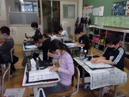 今日の書写の学習では、毛筆で初めて小筆を使いました。また、初めて、墨を使うという体験もしました。