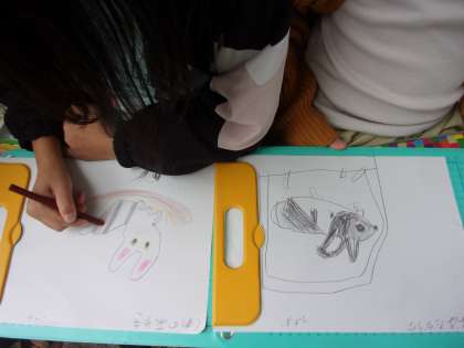 初めてのはずが、「なでていいの?」「えさをあげてみる。」「だっこもしてみたい。」などと、どんどん自分から触れ合っていました。花や虫とちがう温かさを手で感じるいきものとの関わりから、人もいきものもみんな大切にする心も育ててほしいです。