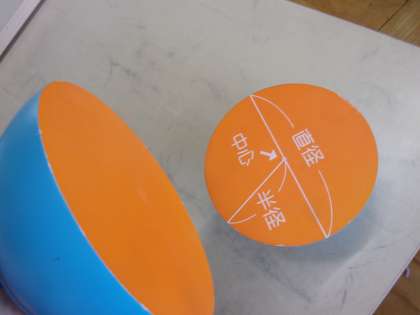 算数科で「円と球」の学習をしています。球ってどんな形?というところから始まり、球の性質について学習しました。断面図が見られる模型を見て、半径・直径・中心の確認をしました。円と同じく、球にもあることを学びました。