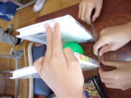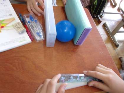 そして、ボールの直径を班で協力して測りました。筆箱などを壁にしてまっすぐになるようにし、工夫してはかることができました。