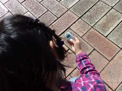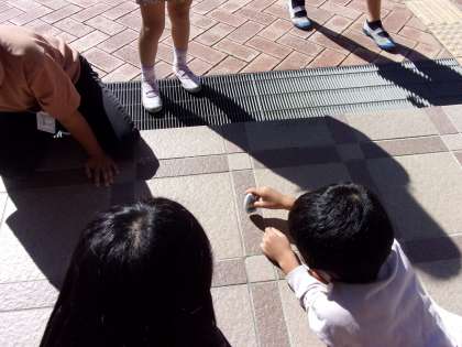 一人一回ずつ測定を体験しています。自分の陰で地面に陰を作ってしまわないように体の向きを工夫しながら測定することができました。