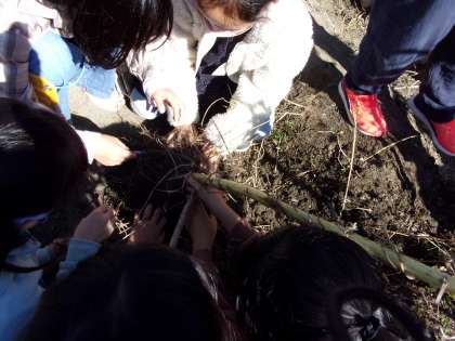 すっかりカラカラになった畑の植物たち。茶色くなった色や先が割れた実の様子を見るだけでなく、種を採って手で触ってみたり、根を掘り返して、根の様子を観察してみたりと手で触れながら観察している様子も見られました。