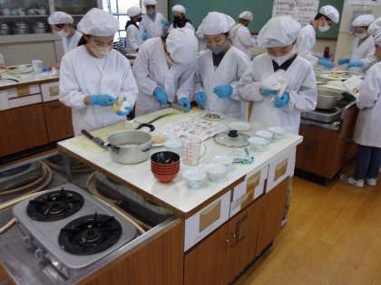 家庭科「食べて元気ご飯とみそ汁」の学習では、前回お米を炊く実習を行いました。今回は、みそ汁作りをしました。