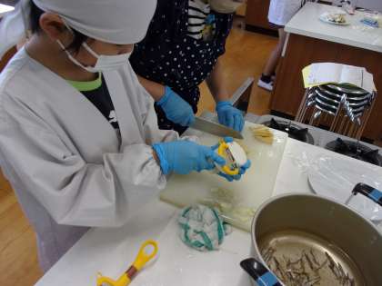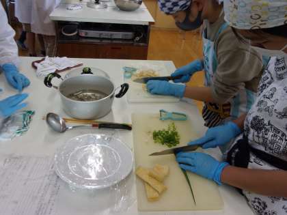 家庭科「食べて元気ご飯とみそ汁」のみそ汁つくりでは、大根・油揚げ・ねぎを実にしてつくりました。班で協力しておいしいみそ汁が出来上がりました。
