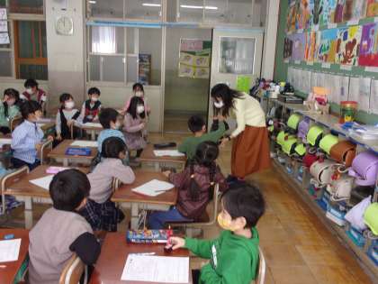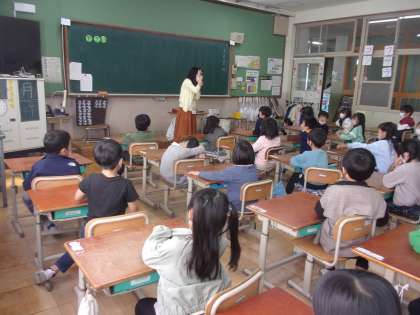 栄養教諭の片山先生の食の学習がありました。今回は、野菜がテーマです。はじめは、みんなが知っている野菜をたくさん思い出しながら、野菜ビンゴをしました。子どもたちは、今まで食べてきた野菜を思い出しながら、ビンゴカードに野菜の名前を書いていきます。トマト・にんじん・ブロッコリー・ピーマンなど、どんどん出てきました。片山先生手作りの野菜カードを引きながら楽しくビンゴをしました。