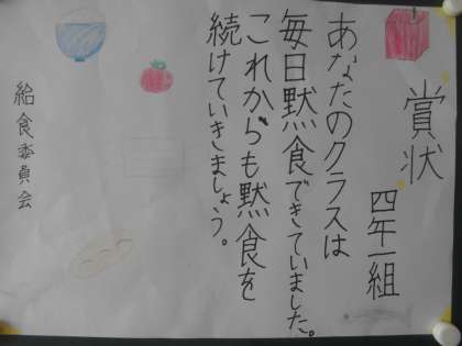 給食委員会から賞状をいただきました。