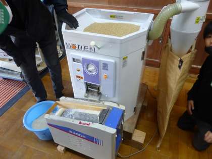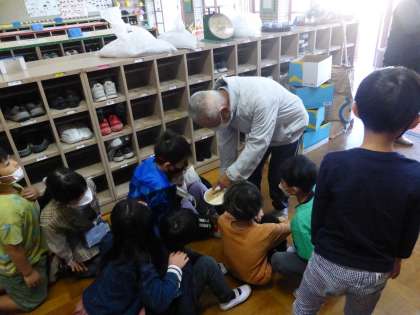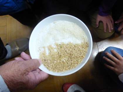 黄色い玄米から白い白米に変わり,子どもたちは大興奮です。