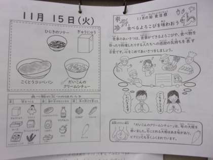 ○今日のクリームシチューは、じゃがいもじゃなくて大根が入っていることに気づいた。ひじきの中のむらさき色の豆も少しにがてだったけど、のこさず食べられた!(4年生)