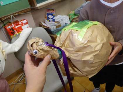 大きい袋を膨らませたりくしゃくしゃにして遊んでいます。