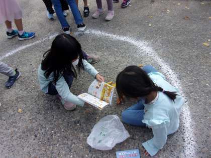 生活科の「あきといっしょに」では、秋見つけをして、季節のあそびを楽しんでいます。写真では、学校に落ちている落ち葉やどんぐりを使ってあそんでいます。