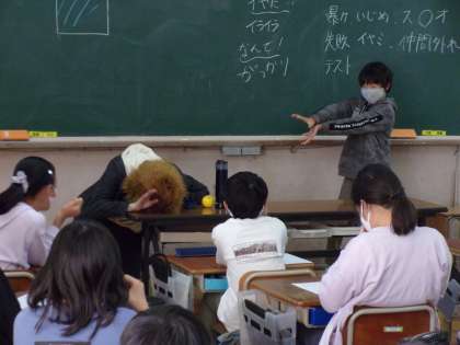 「ストレスと工夫して付き合おう!目指せ!名人シート!」というプリンとを使いながら、寸劇を交えて楽しくわかりやすくお話ししてくださり、学習後のアンケートには「ストレスがたまったときは、上手に発散したい。」「兄弟喧嘩でストレスがたまるのですがどうしたらいいですか?」など白原先生へのメッセージがたくさん記入されていました。