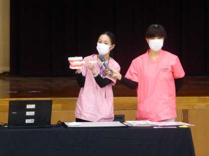 京都市教育委員会の歯科衛生士さんや学校医の中山先生に来ていただき,歯磨きや虫歯についてのお話をしていただきました。