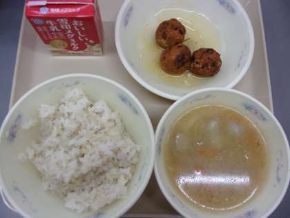 「がんもどきのあんかけ」のがんもどきは、鶏ひき肉・とうふ・おからパウダー・にんじん・えだ豆・干ししいたけと、たくさんの食材をこねて、給食室で1つ1つ丸めて、油で揚げました!「おいしいな」「もっとほしいな」という声を聞けて、よかったです♪