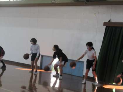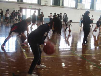 女子バスケットボール部では、ドリブルやパスなどのコツを教わりながら体験しました。