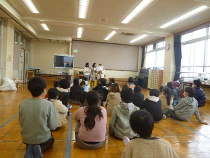 子どもたちで計画したお楽しみ会が開催されました。その名も「紅白いろいろ合戦」。紅白チームに分かれ、それぞれのグループからクイズやダンス、二人羽織でピアノ演奏など、楽しい演目が披露され大爆笑の1時間を過ごしました。