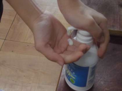 今回は、手洗いが上手にできているか確かめるために、蛍光剤入りのローションを手に塗って、ブラックライトに手をかざしてみました。
