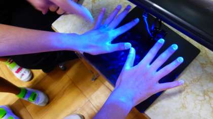 ブラックライトを使って手洗いチェックです。