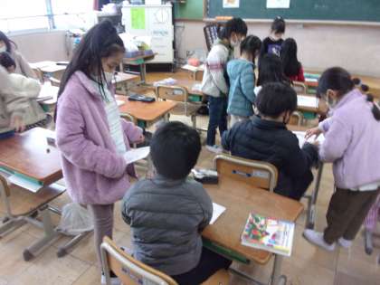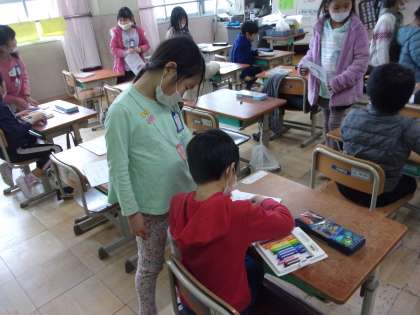 そして、さなぎになったいもむしさんをちょうちょにするために、英語を使って9色の色集めをしました。だんだんと英語でのやりとりができるようになってきています。まだ覚えていない英語もカタカナでメモして覚えたり友だちに教えてもらったり、ちょうちょを早くつくりたいと頑張っています。