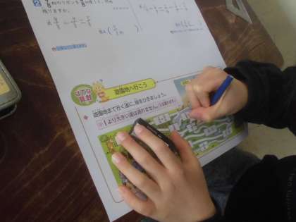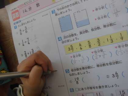帯分数を仮分数になおして加減の計算をしたり、分数の数直線を使って等しい分数を見つけたりする問題に挑戦しました。