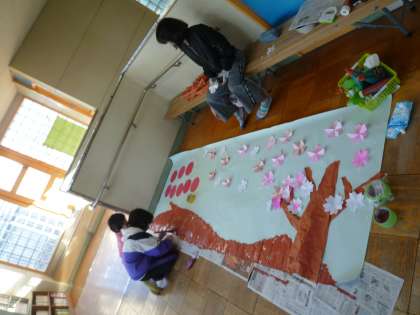 6年生の卒業をお祝いする掲示を作成しています。子どもたちがアイディアを持ち寄り、楽しく進めています。